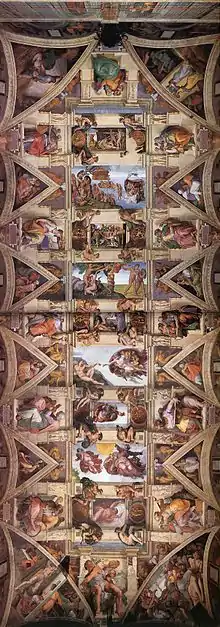 Le Plafond de la Chapelle, où se trouve la voûte, décorée de fresques achevées par Michel-Ange en quatre ans, est inaugurée par Jules II le . Pape guerrier, assoiffé de pouvoir et désireux de rendre à Rome sa splendeur passée, il avait déjà fait appel à Michel-Ange pour la conception de son immense tombeau, projet qui restera inachevé[19]. L'idée de faire refaire la décoration de la voûte par Michel-Ange doit lui venir en avril 1506, comme en témoigne une lettre envoyée à l'artiste par le maître d'œuvre florentin Piero Rosselli, qui a appris la nouvelle du pape lui-même. Le départ précipité de Michel-Ange de Rome, en raison des intrigues qui ont bloqué son projet grandiose pour le tombeau, suspend le projet jusqu'à la réconciliation avec le pape qui a lieu en 1507.