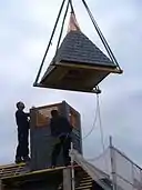 - le remplacement de toute la toiture par l'entreprise Ramel Charpente, qui a déposé l'ancien toit et réalisé une toiture et un clocher flambant neufs dont l'installation a été assez spectaculaire.