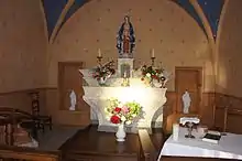 L’édifice est de taille modeste et se compose d’une nef rectangulaire, voutée en berceau et terminée par une abside en cul-de-four. Le toit est recouvert d’ardoises noires. Elle est percée de deux fenêtres latérales qui comportent des vitraux qui laissent entrer une lumière douce. La façade principale est surmontée d’un clocher en pavillon abritant une cloche datant du XVIIe siècle. Sous le clocher existe une niche qui devait renfermer une statue de la sainte Vierge.