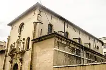 La partie la plus attractive de cette église simple est la façade. Le portail monumental baroque, rue André-Lacroix, a conservé sa menuiserie d’origine. La porte s’inscrit dans une travée corinthienne, surmontée d’un fronton cintré brisé et d’un édicule à niche[2]. La façade est percée de deux fenêtres simples en plein cintre de part et d’autre du portail, et d’un oculus circulaire au-dessus.