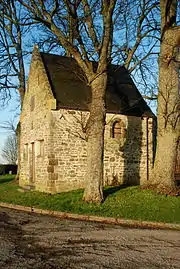 La façade occidentale, remaniée au XIXe siècle[4], est percée d'une petite porte rectangulaire et de deux petites baies carrées. Chacune de ces trois ouvertures est surmontée d'un arc de décharge en briques qui contraste avec la maçonnerie de moellons. Elle est cantonnée de chaînages d'angle réalisés au moyen de gros blocs de grès ferrugineux.
