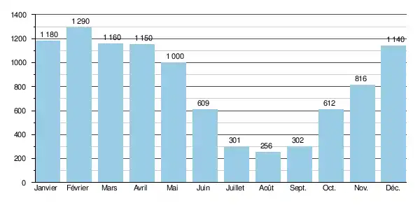 Les crues, quant à elles, peuvent être importantes, compte tenu de la taille modeste de la rivière et de son bassin versant. Les QIX 2 et QIX 5 valent respectivement 12 et 18 m3/s. Le QIX 10 est de 22 et le QIX 20 de 26 m3/s, tandis que le QIX 50 se monte à 315 m3/s.