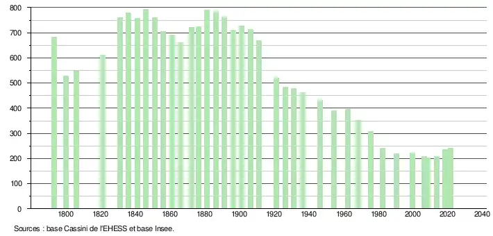 L'évolution du nombre d'habitants est connue à travers les recensements de la population effectués dans la commune depuis 1793. Pour les communes de moins de 10 000 habitants, une enquête de recensement portant sur toute la population est réalisée tous les cinq ans, les populations légales des années intermédiaires étant quant à elles estimées par interpolation ou extrapolation[17]. Pour la commune, le premier recensement exhaustif entrant dans le cadre du nouveau dispositif a été réalisé en 2008[18].