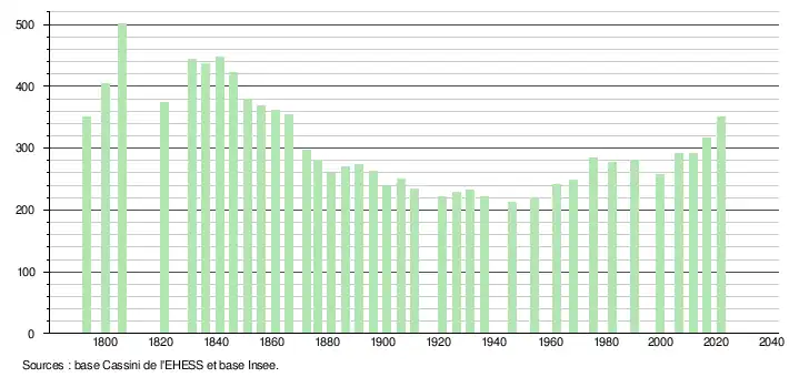 L'évolution du nombre d'habitants est connue à travers les recensements de la population effectués dans la commune depuis 1793. Pour les communes de moins de 10 000 habitants, une enquête de recensement portant sur toute la population est réalisée tous les cinq ans, les populations légales des années intermédiaires étant quant à elles estimées par interpolation ou extrapolation[24]. Pour la commune, le premier recensement exhaustif entrant dans le cadre du nouveau dispositif a été réalisé en 2006[25].