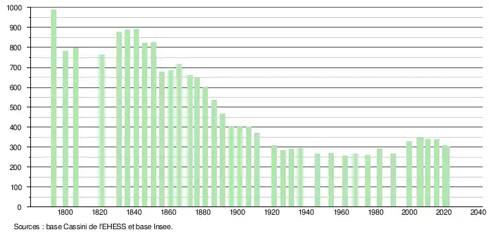 L'évolution du nombre d'habitants est connue à travers les recensements de la population effectués dans la commune depuis 1793. Pour les communes de moins de 10 000 habitants, une enquête de recensement portant sur toute la population est réalisée tous les cinq ans, les populations légales des années intermédiaires étant quant à elles estimées par interpolation ou extrapolation[26]. Pour la commune, le premier recensement exhaustif entrant dans le cadre du nouveau dispositif a été réalisé en 2005[27].