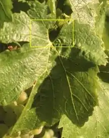 - Feuilles adultes orbiculaires, entières ou à 5 lobes, sinus pétiolaire ouvert à fond souvent limité par la nervure près du point pétiolaire (caractéristique majeure pour le distinguer du pinot blanc B), dents courtes rectilignes et un limbe bullé.