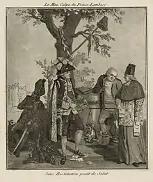 Aquatinte anonyme de 1789 montrant le prince de Lambesc, assis à gauche, écoutant trois représentants de la noblesse, du clergé et du tiers état qui discutent de son cas. On aperçoit à l'arrière-plan la prise de la Bastille.