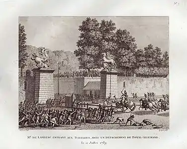 Le , le prince de Lambesc reçoit l'ordre de disperser la foule assemblée sur la place Louis XV (actuelle place de la Concorde) pour manifester contre le renvoi de Necker.