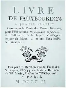 - Livre de Fauxbourdons a quatre parties : Contenant la Prose des Morts ; Miseremini, pour l’Elevation ; De profundis ; O salutaris, de l’Allouette ; & de Dugué ; O Filii, pour le jour de Pâque ; & les huit Tons des Ps. & cantiques Manuscrit in-folio de 47 pages, daté 1802, fait par « Ch. Berthot, rue du Faubourg S. Jacques, N°144 vis-a-vis le bâtiment de Ste-Marie, maison du Citoyen Chevreuil ». Écrit à l’encre vermillon et bistre. La page de titre est faite au pochoir et utilise plusieurs couleurs. En 2010, en vente dans une librairie parisienne. Ce manuscrit contient des faux-bourdons de Jean-François Lalouette et de l’abbé Dugué, deux compositeurs parisiens de la fin du XVIIIe siècle.