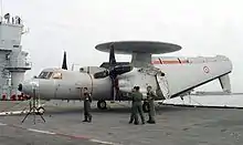 - 2 avions de guet avancé et de contrôle aérien E-2C standard Hawkeye 2000 de la Flottille 4F qui permettent de suivre 2 000 pistes propres et 700 pistes ou points de référence issus d'autres unités jusqu'à une distance de plus de 250 nautiques avec le Radar et jusqu'à plus de 300 nautiques avec le transpondeur IFF[43]; des adaptations électriques ont été effectuées lors du dernier ATM afin d'être prêt à recevoir les E-2D Advanced Hawkeye qui remplaceront les E-2C entre 2026 et 2028[44] ;