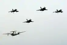- 30 (avec un maximum de 36[41]) chasseurs-bombardiers Rafale Marine F3-R selon l'embarquement de 2 ou 3 des Flottilles 11F, 12F et 17F. Les chasseurs-bombardiers Super-Étendard modernisé (SEM) ont été retirés du service avec le dernier catapultage d'un Super-Étendard, piloté par le commandant de la flottille de la 17F, qui a eu lieu le [42].