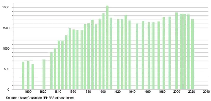 L'évolution du nombre d'habitants est connue à travers les recensements de la population effectués dans la commune depuis 1793. Pour les communes de moins de 10 000 habitants, une enquête de recensement portant sur toute la population est réalisée tous les cinq ans, les populations légales des années intermédiaires étant quant à elles estimées par interpolation ou extrapolation[33]. Pour la commune, le premier recensement exhaustif entrant dans le cadre du nouveau dispositif a été réalisé en 2005[34].