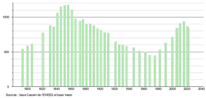 L'évolution du nombre d'habitants est connue à travers les recensements de la population effectués dans la commune depuis 1793. Pour les communes de moins de 10 000 habitants, une enquête de recensement portant sur toute la population est réalisée tous les cinq ans, les populations légales des années intermédiaires étant quant à elles estimées par interpolation ou extrapolation[25]. Pour la commune, le premier recensement exhaustif entrant dans le cadre du nouveau dispositif a été réalisé en 2005[26].