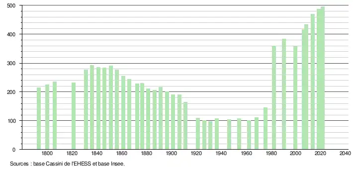 L'évolution du nombre d'habitants est connue à travers les recensements de la population effectués dans la commune depuis 1793. Pour les communes de moins de 10 000 habitants, une enquête de recensement portant sur toute la population est réalisée tous les cinq ans, les populations légales des années intermédiaires étant quant à elles estimées par interpolation ou extrapolation[19]. Pour la commune, le premier recensement exhaustif entrant dans le cadre du nouveau dispositif a été réalisé en 2008[20].