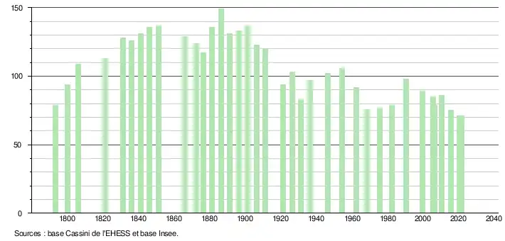 L'évolution du nombre d'habitants est connue à travers les recensements de la population effectués dans la commune depuis 1793. Pour les communes de moins de 10 000 habitants, une enquête de recensement portant sur toute la population est réalisée tous les cinq ans, les populations légales des années intermédiaires étant quant à elles estimées par interpolation ou extrapolation[21]. Pour la commune, le premier recensement exhaustif entrant dans le cadre du nouveau dispositif a été réalisé en 2005[22].