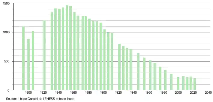 L'évolution du nombre d'habitants est connue à travers les recensements de la population effectués dans la commune depuis 1793. Pour les communes de moins de 10 000 habitants, une enquête de recensement portant sur toute la population est réalisée tous les cinq ans, les populations légales des années intermédiaires étant quant à elles estimées par interpolation ou extrapolation[20]. Pour la commune, le premier recensement exhaustif entrant dans le cadre du nouveau dispositif a été réalisé en 2006[21].