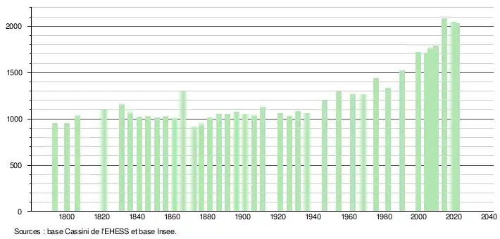 L'évolution du nombre d'habitants est connue à travers les recensements de la population effectués dans la commune depuis 1793. Pour les communes de moins de 10 000 habitants, une enquête de recensement portant sur toute la population est réalisée tous les cinq ans, les populations légales des années intermédiaires étant quant à elles estimées par interpolation ou extrapolation[18]. Pour la commune, le premier recensement exhaustif entrant dans le cadre du nouveau dispositif a été réalisé en 2004[19].