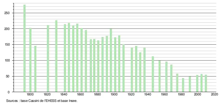 L'évolution du nombre d'habitants est connue à travers les recensements de la population effectués dans la commune depuis 1793. À partir du , les populations légales des communes sont publiées annuellement dans le cadre d'un recensement qui repose désormais sur une collecte d'information annuelle, concernant successivement tous les territoires communaux au cours d'une période de cinq ans. Pour les communes de moins de 10 000 habitants, une enquête de recensement portant sur toute la population est réalisée tous les cinq ans, les populations légales des années intermédiaires étant quant à elles estimées par interpolation ou extrapolation[31]. Pour la commune, le premier recensement exhaustif entrant dans le cadre du nouveau dispositif a été réalisé en 2004[32],[Note 1].