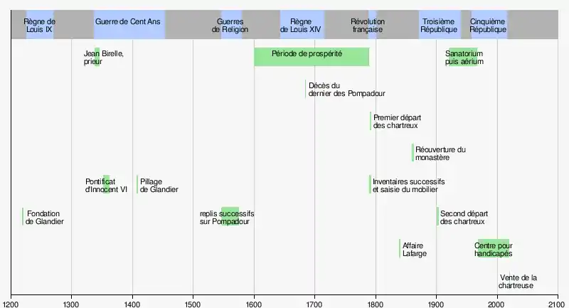 En 1339, Glandier compte une communauté de quinze pères[16]. En 1346, son ancien prieur, Jean Birelle, père profès connu, au niveau de l'Ordre, pour sa grande piété, devint prieur de La Grande Chartreuse, c'est-à-dire Révérend père (ou ministre général) de l'Ordre. Celui-ci refusera ensuite la tiare pontificale, au profit d'Étienne Aubert, futur Innocent VI[17].
