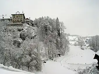 - située sur le sommet d'un énorme rocher, isolé et placé comme un poste de sentinelles pour surveiller deux vallées. Son nom allemand de Thorberg, signifie Porte-du-Mont