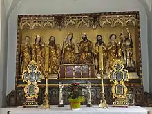 L'élément le plus précieux de l'église est visible dans la chapelle dite « chapelle dorée » de l'église (placée sous le vocable de l'Assomption). Il s'agit d'un ensemble sculpté du gothique tardif germanique absolument unique et réalisé en 1444 dans un atelier de Dantzig. C'est un triptyque de bois sur fond doré qui a fait partie du maître-autel jusqu'en 1639. À ce jour, seule la partie centrale du retable et de la prédelle a survécu. L'ensemble se trouve dans une chapelle de l'église. Le Christ et la Sainte Vierge sont assis chacun sur un trône en hauteur avec à droite saint Jean-Baptiste, saint Jean l'Évangéliste et saint Georges. À gauche, trois figures difficiles à identifier - un saint avec un modèle d'église entre les mains et deux saintes. La prédelle, quant à elle, est ornée d'une peinture du Christ, de Marie et des douze apôtres, six de chaque côté[4].