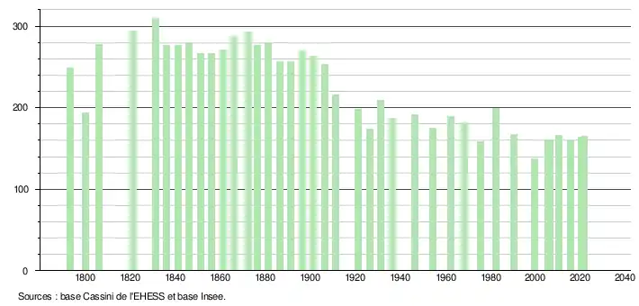 L'évolution du nombre d'habitants est connue à travers les recensements de la population effectués dans la commune depuis 1793. Pour les communes de moins de 10 000 habitants, une enquête de recensement portant sur toute la population est réalisée tous les cinq ans, les populations légales des années intermédiaires étant quant à elles estimées par interpolation ou extrapolation[15]. Pour la commune, le premier recensement exhaustif entrant dans le cadre du nouveau dispositif a été réalisé en 2005[16].