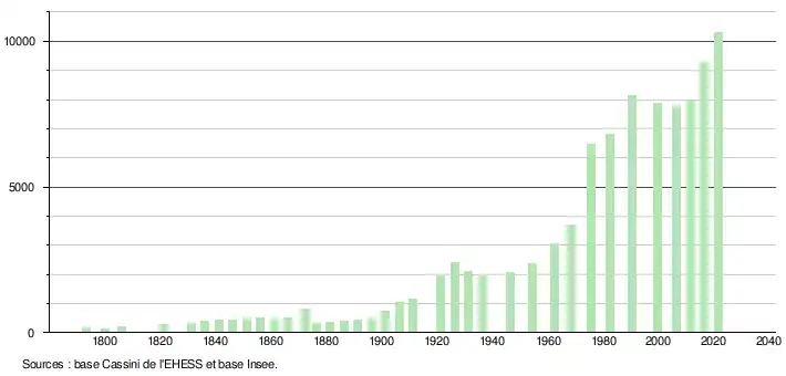 - Par convention dans Wikipédia, le principe a été retenu de n’afficher dans le tableau des recensements et le graphique, pour les populations légales postérieures à 1999, que les populations correspondant à une enquête exhaustive de recensement pour les communes de moins de 10 000 habitants, et que les populations des années 2006, 2011, 2016, etc. pour les communes de plus de 10 000 habitants, ainsi que la dernière population légale publiée par l’Insee pour l'ensemble des communes.