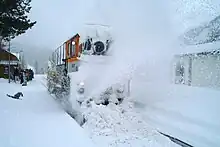 Draisine équipée de socs chasse-neige en action en gare de Bourg-Saint-Maurice.