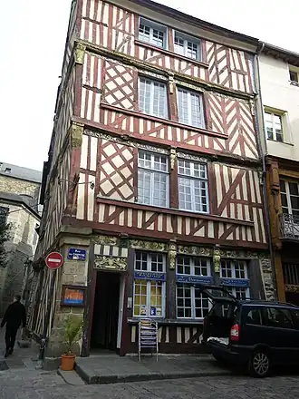 Borne chasse-roue en forme de cône à tête arrondie, située à l'angle du 22, rue du Chapitre à Rennes. La protection de la maison en pan de bois est renforcée par un pan d'angle également en granit.