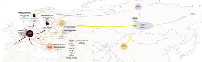 Une étude fondamentale de 2014 a identifié pour la première fois la contribution de trois composantes principales aux lignées européennes modernes : les chasseurs-cueilleurs d'Europe de l'Ouest (WHG, dans des proportions allant jusqu'à 50 % chez les Européens du Nord), les anciens Eurasiens du Nord (ANE, Sibériens du Paléolithique supérieur associés plus tard à l'expansion indo-européenne, présente dans des proportions allant jusqu'à 20 %), et enfin les premiers agriculteurs européens (EEF, agriculteurs d'origine principalement anatolienne qui ont émigré en Europe à partir d'environ 8 000 AP, aujourd'hui présents dans des proportions d'environ 30 % dans la région de la Baltique à environ 90 % en Méditerranée)[17].