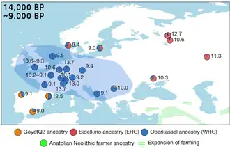 Il a également été constaté que les WHG ont contribué à l'ascendance des populations situées aux frontières de l'Europe, telles que les premiers agriculteurs anatoliens et les anciens Africains du Nord-Ouest[10], ainsi que d'autres groupes européens tels que les chasseurs-cueilleurs de l'Est (EHG)[11]. La relation entre les WHG et les EHG reste peu concluante[11]. Les EHG sont modélisés pour dériver selon divers degrés d'ascendance à partir d'une lignée liée aux WHG, allant de seulement 25 % jusqu'à 91 %, le reste étant lié au flux génétique des Sibériens paléolithiques (ANE) et peut-être des chasseurs-cueilleurs du Caucase. Une autre lignée connue sous le nom de chasseurs-cueilleurs scandinaves (SHG) s'est avérée être un mélange d'EHG et de WHG[12],[5].