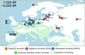 Depuis 2014, d’autres études ont affiné le tableau des croisements entre EEF et WHG. Dans une analyse réalisée en 2017 sur 180 ensembles de données d'ADN anciens des périodes chalcolithique et néolithique de Hongrie, d'Allemagne et d'Espagne, des preuves d'une période prolongée de métissage ont été trouvées. Le mélange a eu lieu au niveau régional, à partir des populations locales de chasseurs-cueilleurs, de sorte que les populations des trois régions (Allemagne, Ibérie et Hongrie) étaient génétiquement distinguables à tous les stades de la période néolithique, avec un ratio progressivement croissant d'ascendance WHG par rapport aux populations agricoles au fil du temps. Cela suggère qu'après l'expansion initiale des premiers agriculteurs, il n'y a plus eu de migrations à longue distance suffisamment importantes pour homogénéiser la population agricole, et que les populations d'agriculteurs et de chasseurs-cueilleurs ont existé côte à côte pendant de nombreux siècles, avec un mélange progressif continu tout au long du Ve au IVe millénaire av. J.-C. (plutôt qu'un seul événement de mélange lors du premier contact)[19]. Les taux de mélange variaient géographiquement ; à la fin du Néolithique, l'ascendance WHG chez les agriculteurs en Hongrie était d'environ 10 %, en Allemagne d'environ 25 % et dans la péninsule ibérique jusqu'à 50 %[20].