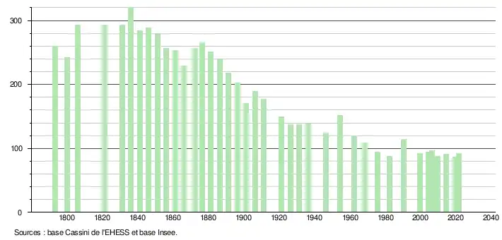 L'évolution du nombre d'habitants est connue à travers les recensements de la population effectués dans la commune depuis 1793. Pour les communes de moins de 10 000 habitants, une enquête de recensement portant sur toute la population est réalisée tous les cinq ans, les populations légales des années intermédiaires étant quant à elles estimées par interpolation ou extrapolation[13]. Pour la commune, le premier recensement exhaustif entrant dans le cadre du nouveau dispositif a été réalisé en 2004[14].