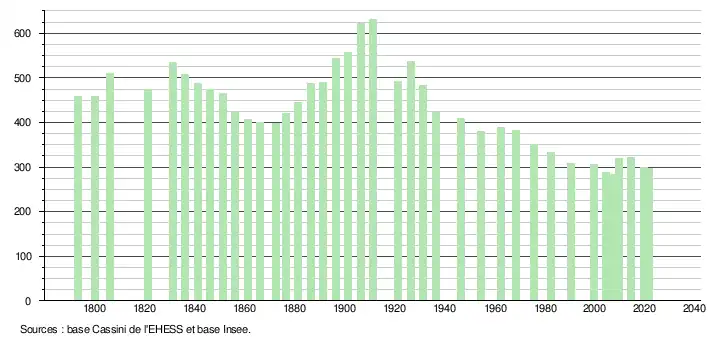 L'évolution du nombre d'habitants est connue à travers les recensements de la population effectués dans la commune depuis 1793. Pour les communes de moins de 10 000 habitants, une enquête de recensement portant sur toute la population est réalisée tous les cinq ans, les populations légales des années intermédiaires étant quant à elles estimées par interpolation ou extrapolation[15]. Pour la commune, le premier recensement exhaustif entrant dans le cadre du nouveau dispositif a été réalisé en 2004[16].
