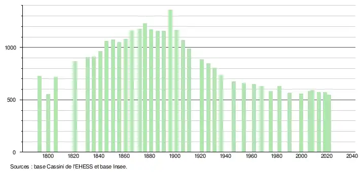 En 2021, la commune comptait 547 habitants[Note 4], en diminution de 4,37 % par rapport à 2015 (Saône-et-Loire : −1,1 %, France hors Mayotte : +1,84 %).