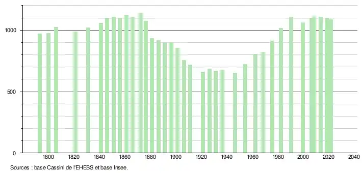 L'évolution du nombre d'habitants est connue à travers les recensements de la population effectués dans la commune depuis 1793. Pour les communes de moins de 10 000 habitants, une enquête de recensement portant sur toute la population est réalisée tous les cinq ans, les populations légales des années intermédiaires étant quant à elles estimées par interpolation ou extrapolation[31]. Pour la commune, le premier recensement exhaustif entrant dans le cadre du nouveau dispositif a été réalisé en 2008[32].