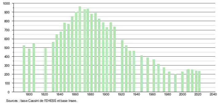 L'évolution du nombre d'habitants est connue à travers les recensements de la population effectués dans la commune depuis 1793. Pour les communes de moins de 10 000 habitants, une enquête de recensement portant sur toute la population est réalisée tous les cinq ans, les populations légales des années intermédiaires étant quant à elles estimées par interpolation ou extrapolation[21]. Pour la commune, le premier recensement exhaustif entrant dans le cadre du nouveau dispositif a été réalisé en 2007[22].