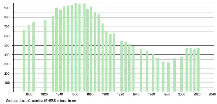 L'évolution du nombre d'habitants est connue à travers les recensements de la population effectués dans la commune depuis 1793. Pour les communes de moins de 10 000 habitants, une enquête de recensement portant sur toute la population est réalisée tous les cinq ans, les populations légales des années intermédiaires étant quant à elles estimées par interpolation ou extrapolation[14]. Pour la commune, le premier recensement exhaustif entrant dans le cadre du nouveau dispositif a été réalisé en 2006[15].