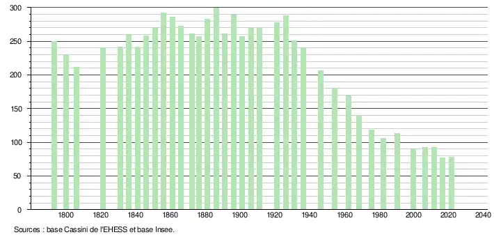 L'évolution du nombre d'habitants est connue à travers les recensements de la population effectués dans la commune depuis 1793. Pour les communes de moins de 10 000 habitants, une enquête de recensement portant sur toute la population est réalisée tous les cinq ans, les populations légales des années intermédiaires étant quant à elles estimées par interpolation ou extrapolation[26]. Pour la commune, le premier recensement exhaustif entrant dans le cadre du nouveau dispositif a été réalisé en 2006[27].
