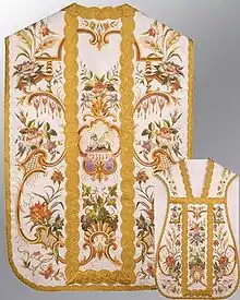 La chasuble est un vêtement sacerdotal à deux pans et sans manche avec une ouverture pour la tête, que le prêtre revêt par-dessus l'aube et l'étole pour célébrer la messe, ou d'autres actions liturgiques précédant ou suivant immédiatement la messe[1].