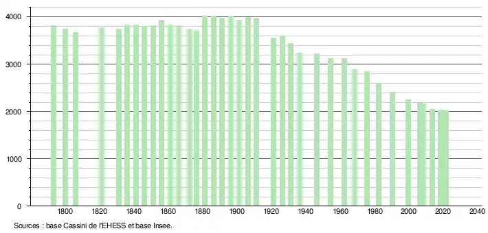 L'évolution du nombre d'habitants est connue à travers les recensements de la population effectués dans la commune depuis 1793. Pour les communes de moins de 10 000 habitants, une enquête de recensement portant sur toute la population est réalisée tous les cinq ans, les populations légales des années intermédiaires étant quant à elles estimées par interpolation ou extrapolation[30]. Pour la commune, le premier recensement exhaustif entrant dans le cadre du nouveau dispositif a été réalisé en 2008[31].