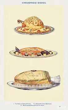 On parlait alors de « fricassée de poulet chaud-froid », la sauce était liée à la gelée (ou aspic) dont on nappe le poulet dès qu'elle commence à prendre[10]. Puis de « chaud-froid de perdreau » (le chaud-froid se fait de la même façon pour le poulet, les perdreaux, bécasses, faisans, grives, sarcelles, lapereaux de garenne et des levrauts)[11]. Les sauces chaud-froid apparaissent chez Urbain Dubois en 1856 (qui écrit chaudfroix) : chaud-froid brune, la sauce chaud-froid blonde, la sauce chaud-froid au sang, la sauce chaud-froid à la Russe ; à l'essence de champignons, à la purée de volaille et de gibier, aux truffes, à la judéenne (velouté, câpres, anchois), à la purée de tomates, à la pêcheuse (beurre d'écrevisses, cuisson d'huitres), à la circasienne (estragon, cerfeuil, pimprenelle, ciboulette, anchois, câpres et cornichons)[12]. Le Baron Brisse ajoute la sauce chaud-froid à la purée d'artichaut, à la ravigote[4].