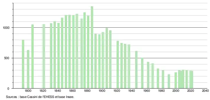 L'évolution du nombre d'habitants est connue à travers les recensements de la population effectués dans la commune depuis 1793. Pour les communes de moins de 10 000 habitants, une enquête de recensement portant sur toute la population est réalisée tous les cinq ans, les populations légales des années intermédiaires étant quant à elles estimées par interpolation ou extrapolation[32]. Pour la commune, le premier recensement exhaustif entrant dans le cadre du nouveau dispositif a été réalisé en 2004[33].