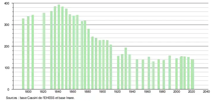 L'évolution du nombre d'habitants est connue à travers les recensements de la population effectués dans la commune depuis 1793. Pour les communes de moins de 10 000 habitants, une enquête de recensement portant sur toute la population est réalisée tous les cinq ans, les populations légales des années intermédiaires étant quant à elles estimées par interpolation ou extrapolation[16]. Pour la commune, le premier recensement exhaustif entrant dans le cadre du nouveau dispositif a été réalisé en 2005[17].