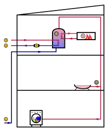 Lorsqu'une chaudière pour le chauffage des pièces est utilisée, l'installation traditionnelle au Royaume-Uni consiste à utiliser l'eau chauffée par la chaudière (primaire - primary) pour chauffer l'eau potable (en anglais secondary) contenue dans un récipient cylindrique (généralement en cuivre) qui est fournie par un récipient ou récipient de stockage d'eau froide, généralement dans l'espace de toit du bâtiment. Cela produit une alimentation assez régulière en eau chaude sanitaire (ECS) à basse pression statique mais généralement avec un bon débit. Dans la plupart des autres parties du monde, les appareils de chauffage à eau n'utilisent pas de récipient ou de réservoir de stockage d'eau froide, mais chauffent l'eau à des pressions proches de celles entrantes du réseau d'alimentation en eau.