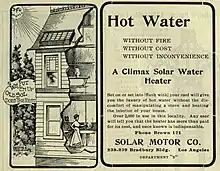 Les premiers enregistrements de collecteurs solaires aux États-Unis remontent avant 1900, avec l'utilisation d'un réservoir peint en noir monté sur un toit[7]. En 1896, Clarence Kemp de Baltimore a placé un réservoir dans une boîte en bois, créant ainsi le premier 'chauffe-eau en lot' tel qu'il est connu aujourd'hui. Frank Shuman a édifié la première centrale solaire thermique du monde à Maadi, en Égypte, en se servant de réflecteurs paraboliques pour alimenter un moteur de 45 à 52 kilowatts (60 à 70 chevaux), qui acheminait 23 000 litres (6 000 gallons américains) d'eau par minute du Nil vers les champs de coton avoisinants.