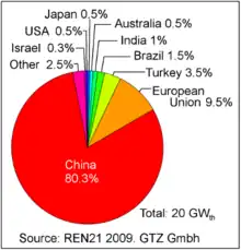 Les systèmes de chauffage solaire de l'eau sont populaires en Chine, où les modèles de base commencent à environ 1 500 yuans (235 dollars américains), soit environ 80 % moins chers que dans les pays occidentaux pour une taille de collecteur donnée. Au moins 30 millions de foyers chinois en possèdent un. La popularité s'explique par l'utilisation de tubes sous vide efficaces qui permettent aux chauffe-eau de fonctionner même par temps nuageux et à des températures bien inférieures à zéro[17].