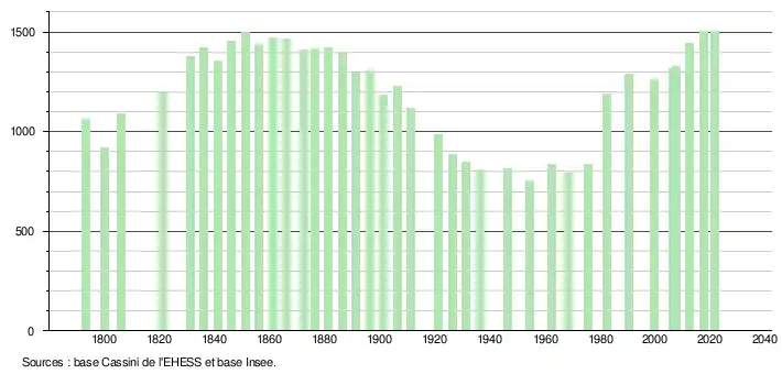 L'évolution du nombre d'habitants est connue à travers les recensements de la population effectués dans la commune depuis 1793. Pour les communes de moins de 10 000 habitants, une enquête de recensement portant sur toute la population est réalisée tous les cinq ans, les populations légales des années intermédiaires étant quant à elles estimées par interpolation ou extrapolation[20]. Pour la commune, le premier recensement exhaustif entrant dans le cadre du nouveau dispositif a été réalisé en 2007[21].
