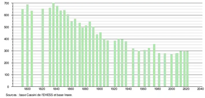 L'évolution du nombre d'habitants est connue à travers les recensements de la population effectués dans la commune depuis 1793. Pour les communes de moins de 10 000 habitants, une enquête de recensement portant sur toute la population est réalisée tous les cinq ans, les populations légales des années intermédiaires étant quant à elles estimées par interpolation ou extrapolation[26]. Pour la commune, le premier recensement exhaustif entrant dans le cadre du nouveau dispositif a été réalisé en 2007[27].