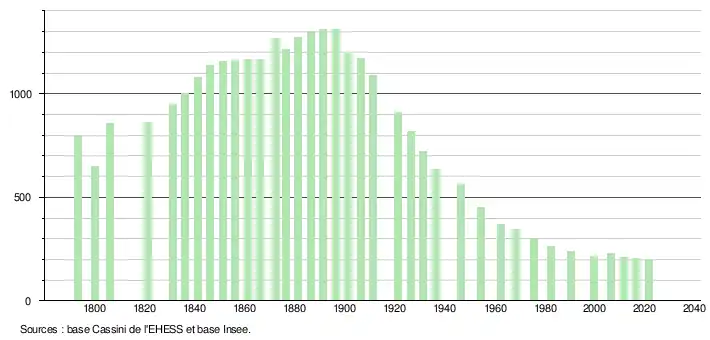 L'évolution du nombre d'habitants est connue à travers les recensements de la population effectués dans la commune depuis 1793. Pour les communes de moins de 10 000 habitants, une enquête de recensement portant sur toute la population est réalisée tous les cinq ans, les populations légales des années intermédiaires étant quant à elles estimées par interpolation ou extrapolation[18]. Pour la commune, le premier recensement exhaustif entrant dans le cadre du nouveau dispositif a été réalisé en 2006[19].